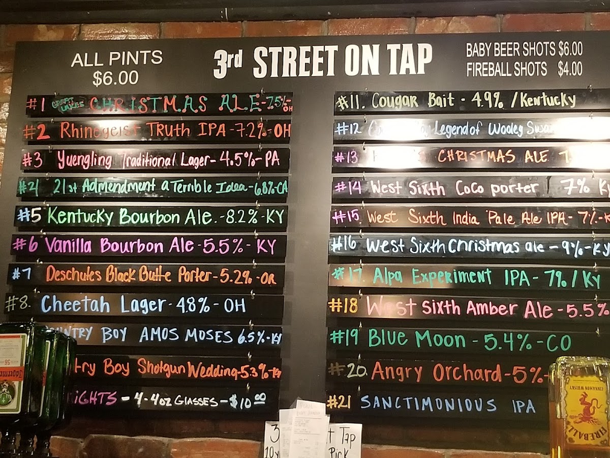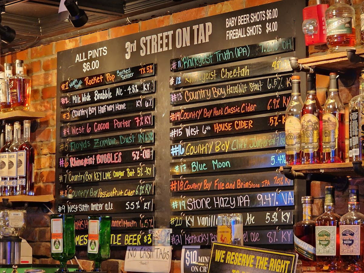 The menu at 3rd Street Tap House offers a relaxed selection of casual drinks and simple bites, well-suited to its laid-back bar atmosphere. Patrons can enjoy a range of craft beers, including local Kentucky Bourbon Ale and dark options like Deschules Black Butte Porter, alongside creative cocktails such as the Vegas Bomb or a refreshing Patrón Margarita.